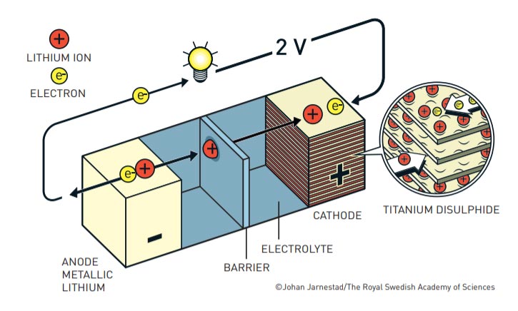ในช่วงแรกได้ใช้ Titanium Disulphide เป็นวัสดุในการผลิตขั้วแคโทด(ขั้วบวก) ของแบตเตอรี่ลิเทียม ส่วนขั้วแอโนด(ขั้วลบ) ผลิตจาก Metallic Lithium ซึ่งสามารถปล่อยอิเล็กตรอนได้มาก แต่เกิดการระเบิดได้ง่าย ทำให้ไม่มีความปลอดภัยต่อมนุษย์ อีกทั้งยังจ่ายกระแสไฟฟ้าได้เพียง 2 V เท่านั้น